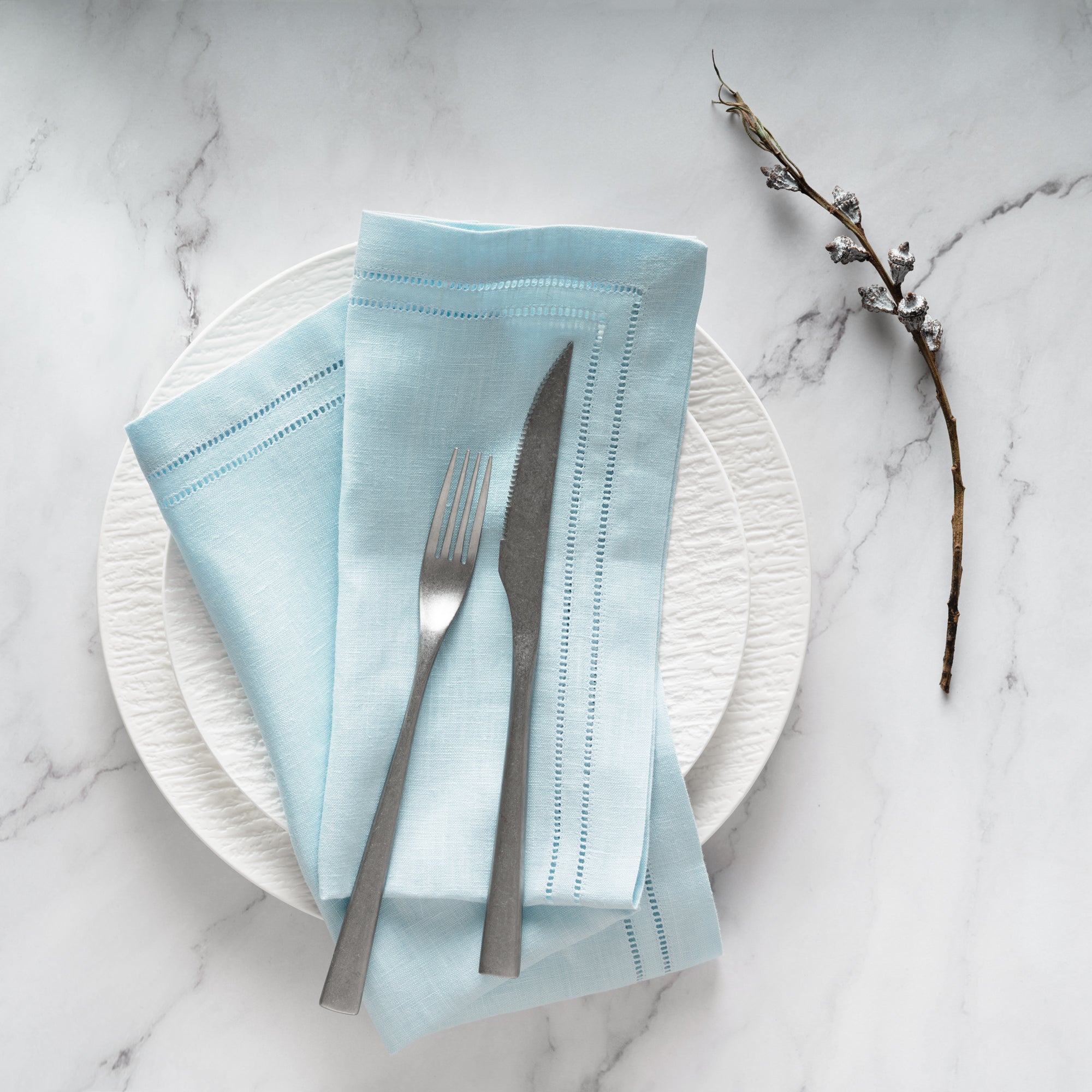 "Linen Double Hemstitch Dinner Napkins have a lovely weave, tatted lace, and excellent quality sewing. These high-quality napkins are perfect for tea carts, breakfast, and luncheons."