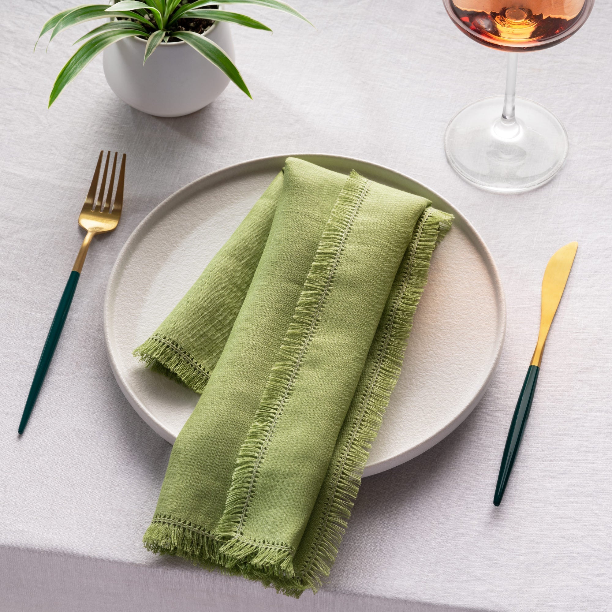 "For formal or informal dinner settings, beautiful, soft linen napkins add elegance, and that word certainly defines these napkins by O’lucio!"